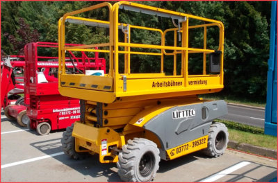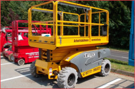Scherenbühnen haben wir in wachsender Zahl im ständigen BestandSie sind für Außeneinsatz und Innenraumtauglich (enger Wenderadius, E-Antrieb),An- und Abtransport übernehmen wir grundsätzlich mit unserem Spezial-LKW.